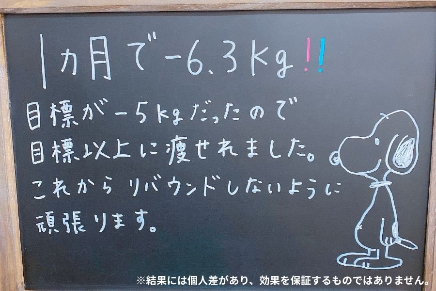 1ヶ月で -6.3kg。目標は-5kgだったので、目標以上に痩せることができました。