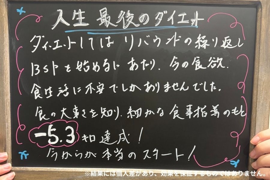 一人では難しい挑戦も、寄り添いながら伴走することで“最後のダイエット”として結果につなげていただけます。